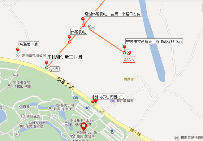 導航到雅戈爾動物園北門,由位于雅戈爾動物園對面的“東錢湖創新工業園”路口進入,向前200m后右轉300米處。
