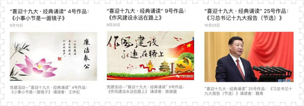 公司黨總支自9月中旬開始,在公司自主開發的微信公眾號推送“喜迎十九大·經典誦讀”活動。每日推送一名黨員同志朗誦的習近平系列講話等經典作品,并在公司“紅色根據地”黨員微信群和QQ群中組織黨員對所誦讀內容進行討論。活動極大地激發了黨員干部們學理論、用理論的熱情。大會召開期間,十九大報告原文更是成了黨員們首選的誦讀作品。
